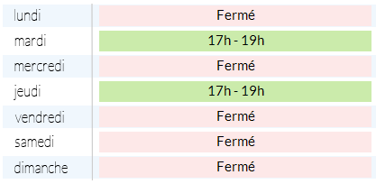 Les horaires d'ouverture sont fournis à titre informatif, hors périodes de congés et ne prennent pas en compte les possibles ouvertures ou fermetures exceptionnelles ainsi que les jours fériés. Pour être certain de ces horaires, veuillez contacter directement l’établissement.